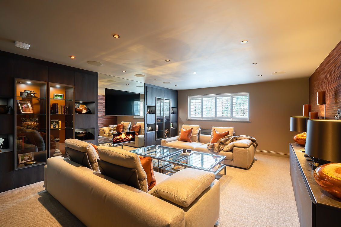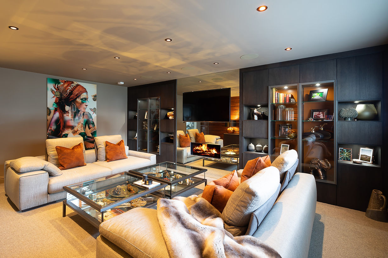 We went with neutral tones for the sofas and carpet, which offset perfectly against the rich, dark backdrop of the bespoke wall units. Colour and warmth are added in the accessories, wall coverings and soft furnishings, tying together the look with rich burnt umber, copper and bronze tones.
